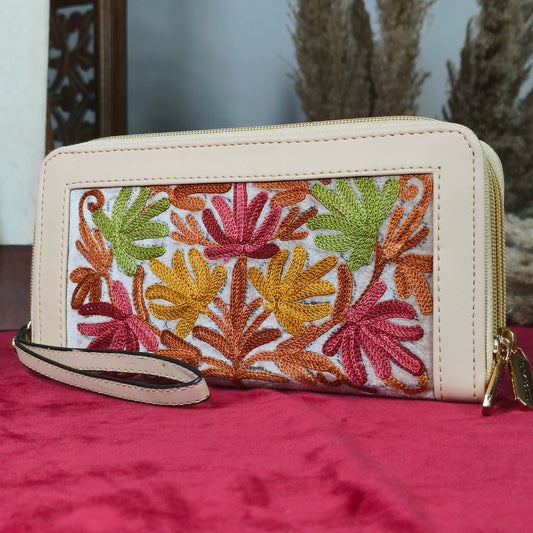 Kashmiri Hand Embroidered Zip Pouch White & Light Green-Dark Green