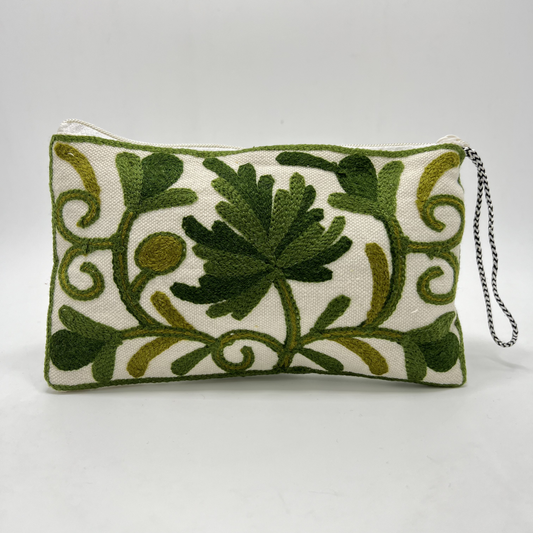Kashmiri Hand Embroidered Zip Pouch White & Light Green-Dark Green