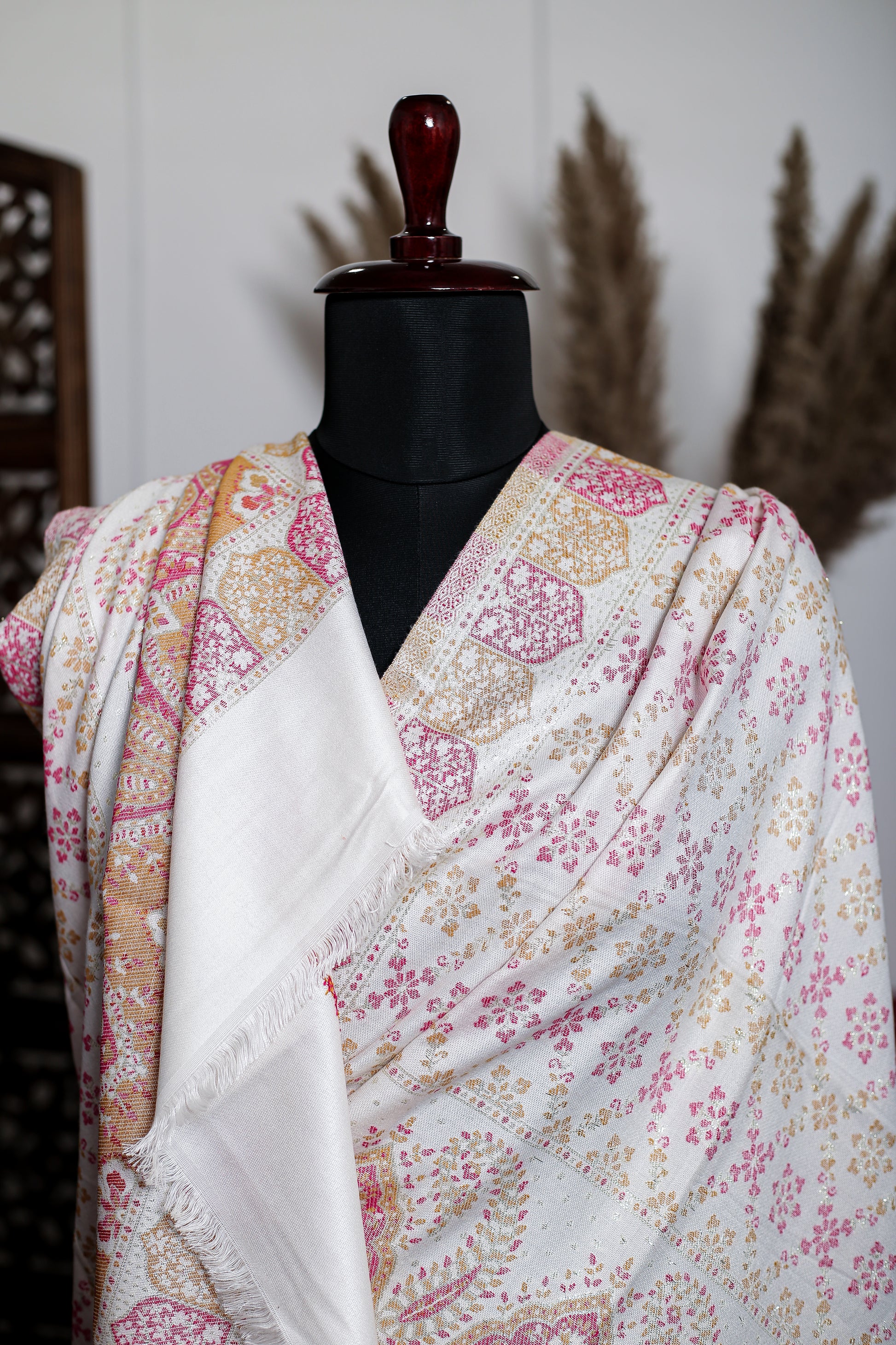 Envelop yourself in finesse with this luxurious pashmina shawl with elegant Zari work. Beautifully Blended Pashmina wool, this shawl coddles the wearer in warmth and softness like no other. The beautiful combination of classic shapes with modern design is presented lavishly with the self-zari intricately embroidered on the front of the shawl.